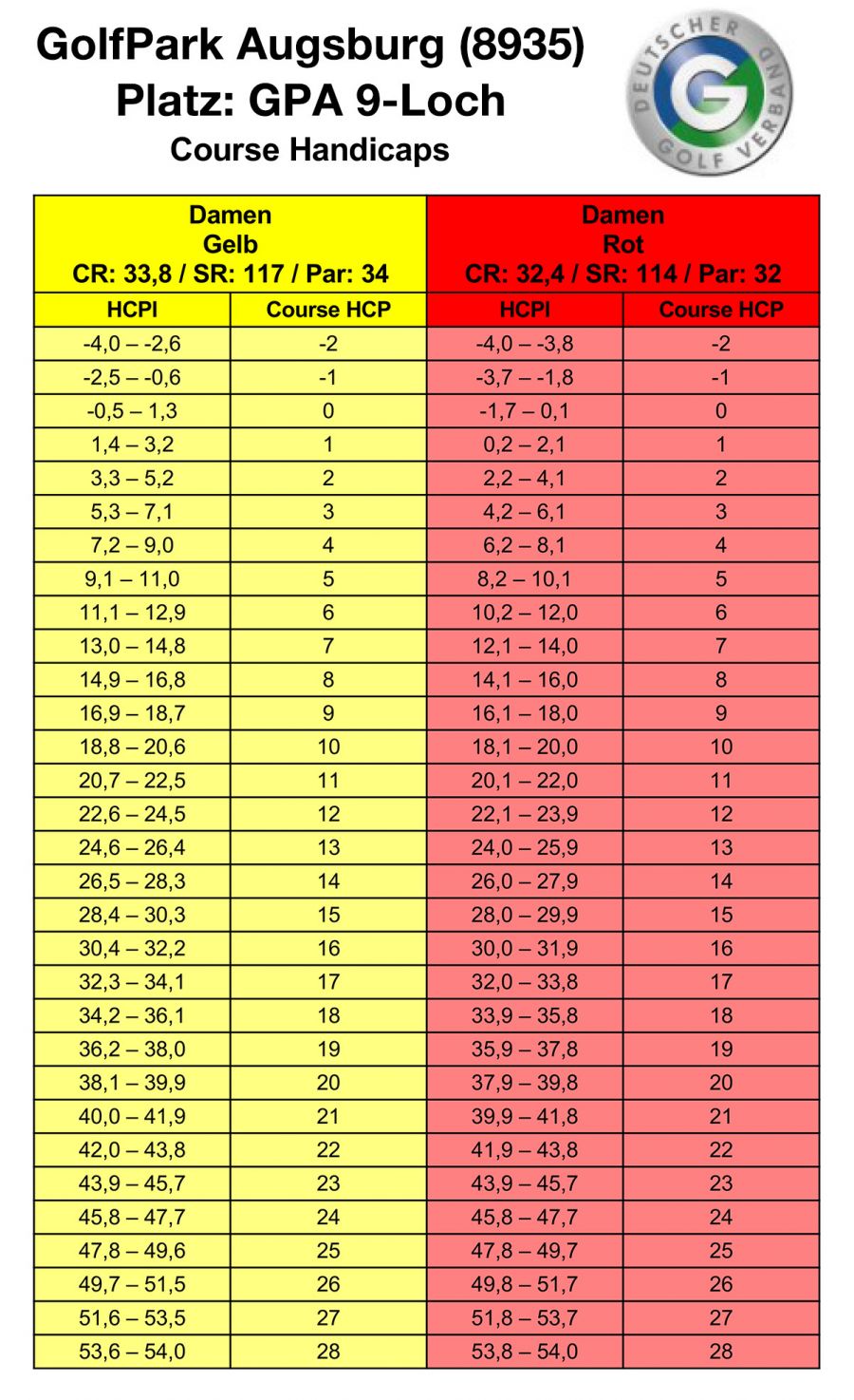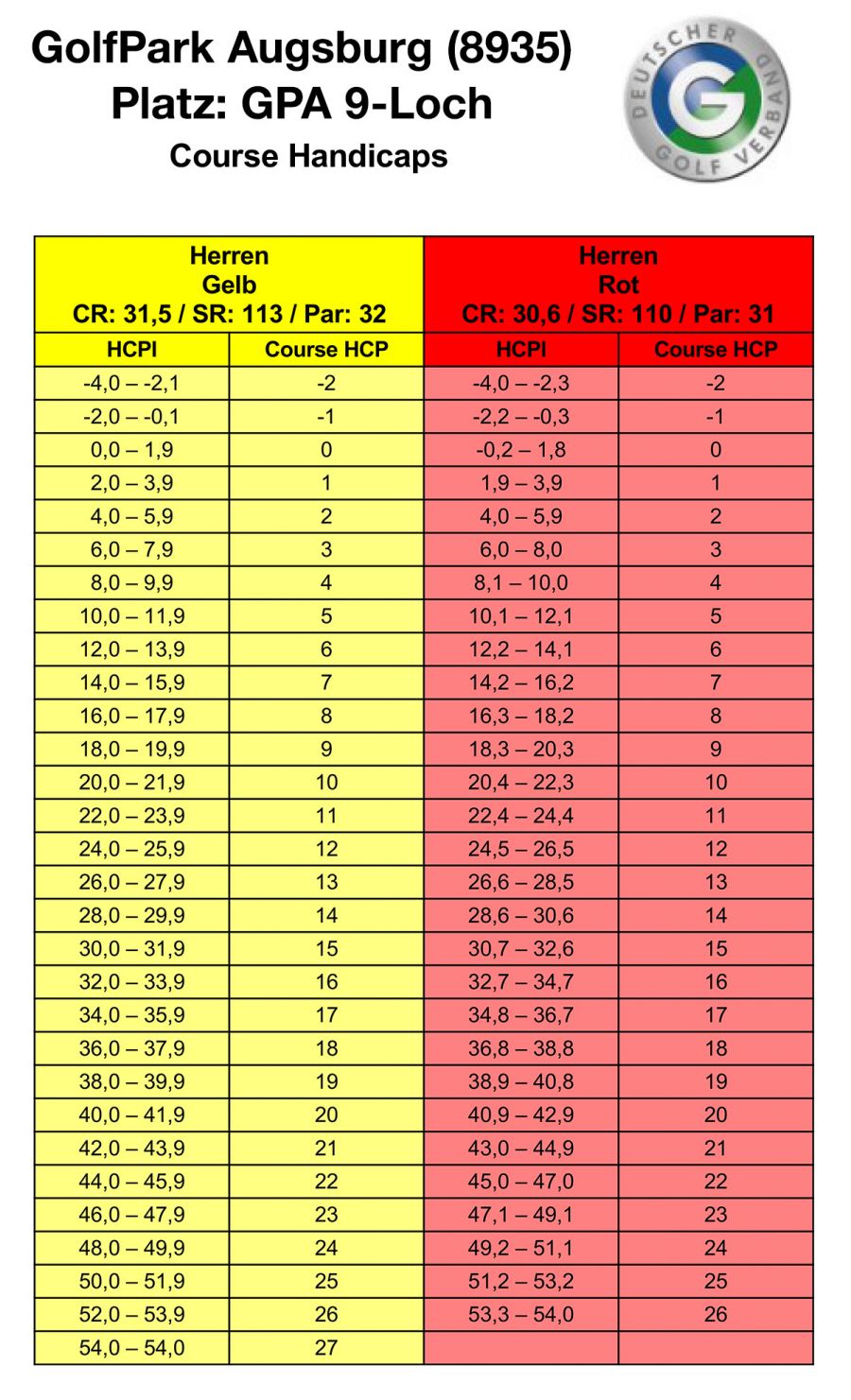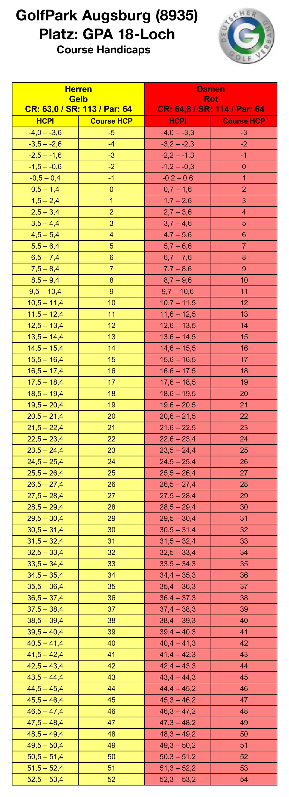 Informieren Sie sich über Ihre Spielvorgabe auf dem Platz des GolfPark Augsburg anhand der Course Handicap-Tabelle.