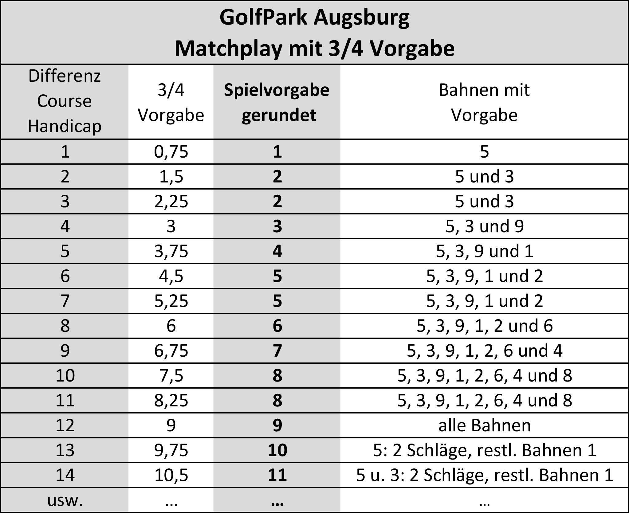 - Nicht-handicaprelevantes Einzel-Lochspiel mit 3/4 Vorgabe (der Course Handicap-Differenz der 9-Loch Course Handicap-Tabelle) in zwei Klassen*